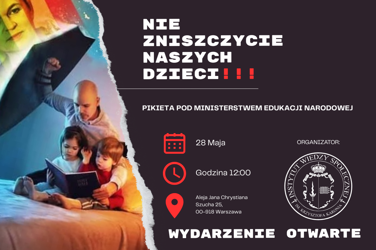 W środę 28 maja o godzinie 12.00 odbędzie się pikieta protestacyjna pod Ministerstwem Edukacji Narodowej w Warszawie (aleja Jana Chrystiana Szucha 25). Organizatorem wydarzenia jest Instytut Wiedzy Społecznej im. Krzysztofa Karonia, który współdziała w ramach Koalicji na Rzecz Ocalenia Polskiej Szkoły (KROPS). Demonstracja ma charakter otwarty, dlatego zapraszamy do udziału wszystkich ludzi dobrej woli.