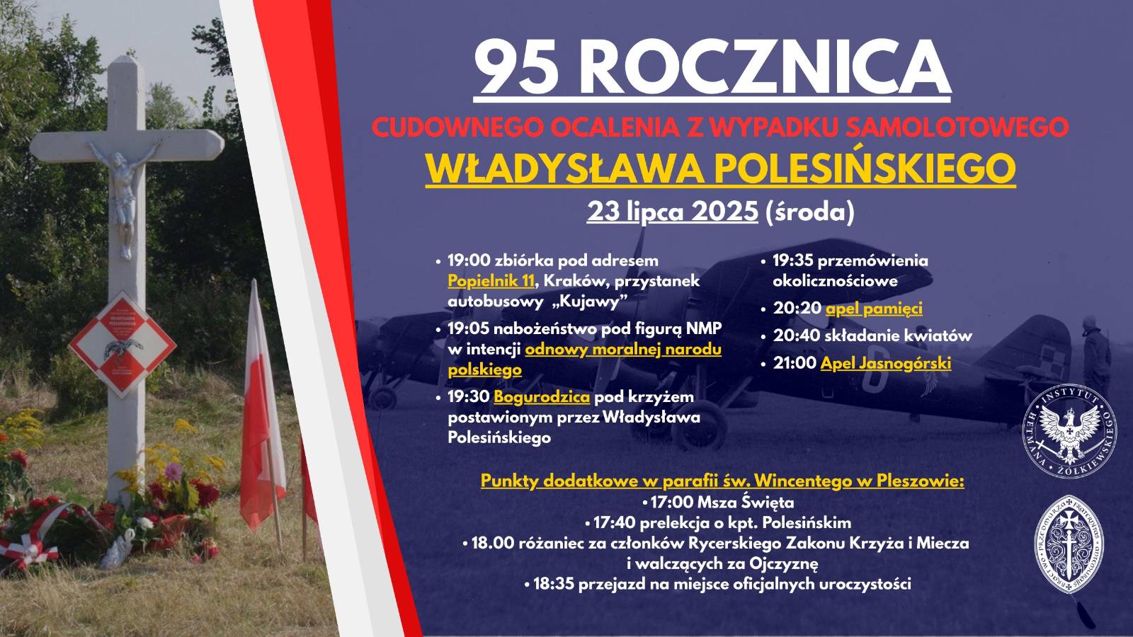 23 lipca 2025 w Krakowie odbędą się obchody cudownego ocalenia kpt. Polesińskiego z katastrofy lotniczej. Wydarzenie rozpocznie się Mszą św. w kościele św. Wincentego w Pleszowie o godz. 17.00. Z kolei o godz. 19.00 planowane jest oficjalne rozpoczęcie uroczystości przy ul. Popielniki 11 w Krakowie (pod przystankiem autobusowym „Kujawy”). Szczegółówy program wydarzenia zamieszczony jest na poniższym plakacie.