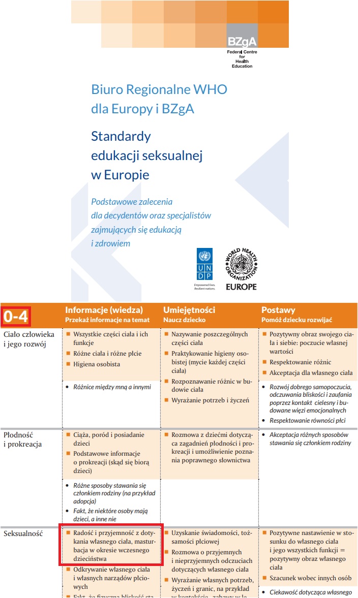 Fragment standardów WHO dotyczący edukacji seksualnej dzieci w wieku 0-4.