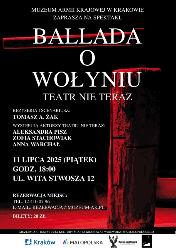 Teatr Nie Teraz i Muzeum Armii Krajowej w Krakowie zapraszają na spektakl „Ballada o Wołyniu” w reżyserii Tomasza A. Żaka.
