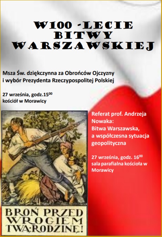 Wierni Parafii Morawica oraz przedstawiciele „PiS Gminy Zabierzów” zapraszają na uroczyste obchody wielkiego zwycięstwa Rzeczypospolitej Polskiej nad bolszewikami pt. „W 100-lecie Bitwy Warszawskiej”.