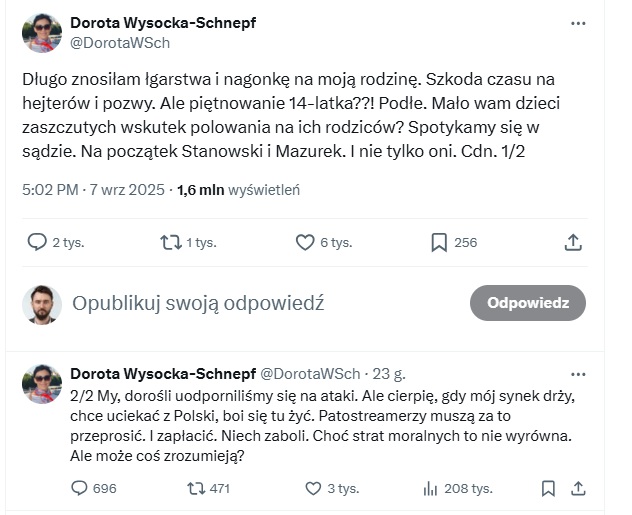 „Długo znosiłam łgarstwa i nagonkę na moją rodzinę. Szkoda czasu na hejterów i pozwy. Ale piętnowanie 14-latka??! Podłe. Mało wam dzieci zaszczutych wskutek polowania na ich rodziców? Spotykamy się w sądzie. Na początek Stanowski i Mazurek. (…) cierpię, gdy mój synek drży, chce uciekać z Polski, boi się tu żyć” – napisała dziennikarka na X.