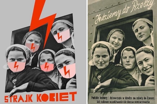Wątpliwości co do prawidłowości skojarzeń symboliki strajku z faszyzmem rozwiewają materiały kolportowane przez strajkujących w mediach społecznościowych. Wśród nich odnajdziemy np. plakat propagandowy III Rzeszy z hasłem: Polskie kobiety i dziewczęta w drodze do Rzeszy, przerobiony na potrzeby protestów.