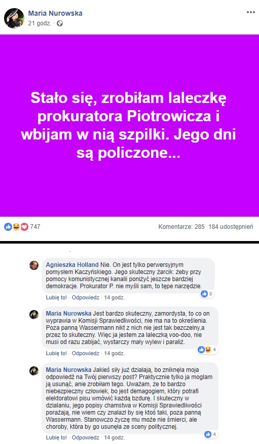 Maria Nurowska wciągnęła się w dyskusję i odpowiedziała: „Jest bardzo skuteczny, zamordysta, to co on wyprawia w Komisji Sprawiedliwości, nie ma na to określenia. Poza panną Wassermann nikt z nich nie jest tak bezczelny, a przez to skuteczny. Więc ja jestem za laleczką voo-doo, nie musi od razu zabijać, wystarczy mały wylew i paraliż”. A w kolejnym wpisie jeszcze dorzuciła: „Stanowczo życzę mu może nie śmierci, ale choroby, która by go usunęła ze sceny politycznej”.