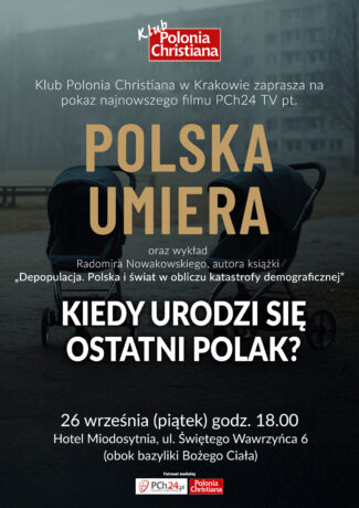 Stowarzyszenie Kultury Chrześcijańskiej im. Księdza Piotra Skargi oraz portal PCh24 TV zapraszają na wyjątkowe spotkanie w krakowskim Klubie „Polonia Christiana” podczas którego odbędzie się prapremiera najnowszego filmu wyprodukowanego przez PCh24 TV pt. „Polska umiera” oraz wykład Radomira Nowakowskiego, autora książki „Depopulacja”.