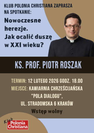 Klub Polonia Christiana w Krakowie zaprasza na spotkanie z ks. prof. Piotrem Roszakiem, które odbędzie się 12 lutego w kawiarni chrześcijańskiej „Pola Dialogu” przy ul. Stradomskiej 6 w Krakowie (obok Kościoła Misjonarzy Nawrócenia św. Pawła).