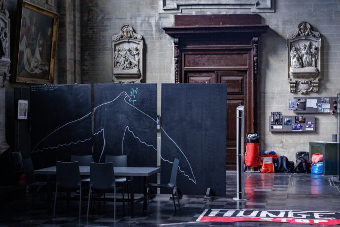 W jego ramach proboszcz po prostu zadomowił w kościele nielegalnie przebywających w kraju cudzoziemców. Migranci koczowali w świętym miejscu. W mediach znaleźć można nagrania i fotografie, ukazujące, jak nawet tuż przy ołtarzach organizowano dla nich miejsca noclegowe, gromadząc tam walizki z dobytkiem. W świątyni zastawiano dla nich stół, ustawiono barek, z którego podawano napoje… a także – umożliwiono publiczną muzułmańską modlitwę.