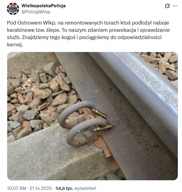 Poznańska policja poinformowała o znalezieniu nabojów karabinowych tzw. ślepych przywiązanych do torów w okolicach Ostrowa Wielkopolskiego. Służby badają sprawę pod kątem ewentualnej prowokacji, wymierzonej w sprawdzanie szybkości reakcji polskiego państwa.