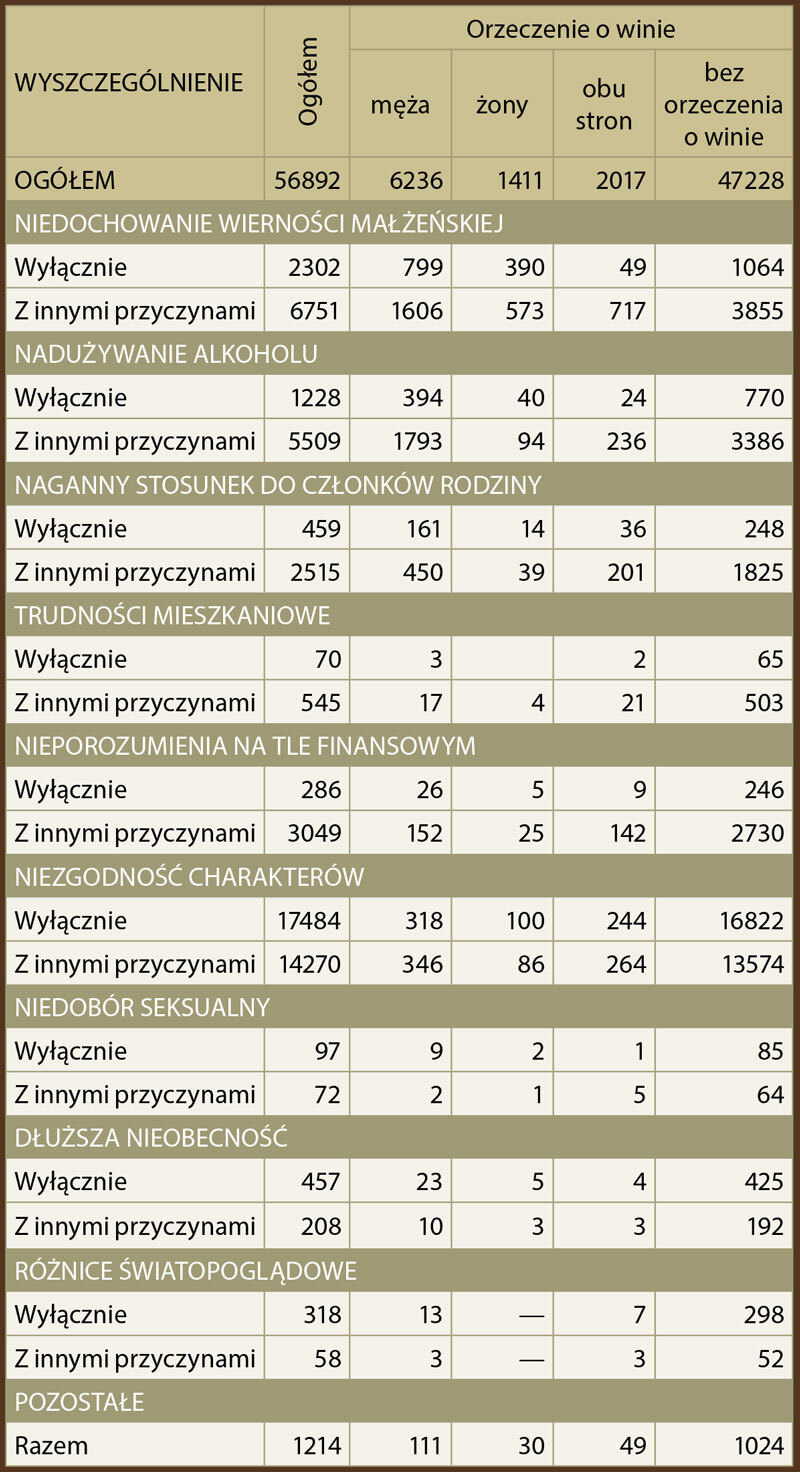Wśród przyczyn rozkładu pożycia małżeńskiego dominuje niezgodność charakterów. W roku 2023 na 56 892 rozwodów była ona podawana jako wyłączna przyczyna w 17 484 przypadkach, a w 14 270 przypadkach wraz z innymi przyczynami. Niedochowanie wierności małżeńskiej wskazano w 9053 przypadkach (16 procent), a nadużywanie alkoholu w 6737 przypadkach (11,8 procent). Łącznie 31 754 przypadków zaklasyfikowanych pod niezgodność charakterów oznacza, że 55 procent małżeństw rozwodzi się, ponieważ osoby, które chciały przeżyć ze sobą życie… przestały do siebie pasować.