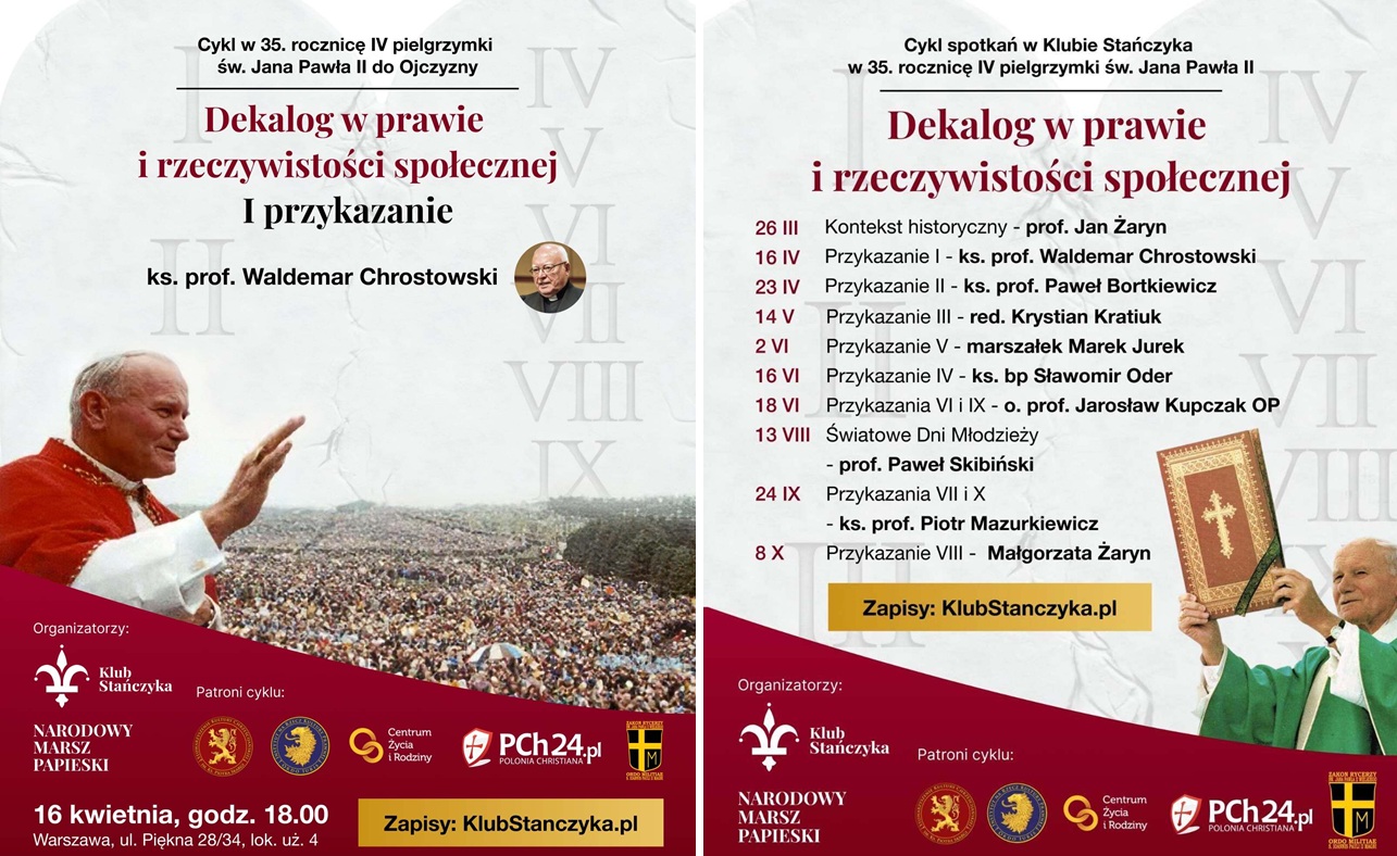 Zapraszamy na wydarzenie w Klubie Stańczyka, będące drugim spotkaniem z cyklu „Dekalog w prawie i rzeczywistości społecznej: 35 lat po IV pielgrzymce św. Jana Pawła II do Ojczyzny”.