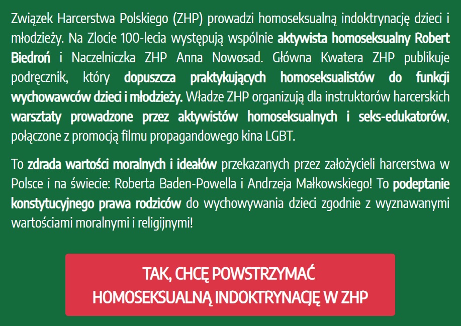 „Związek Harcerstwa Polskiego (ZHP) prowadzi homoseksualną indoktrynację dzieci i młodzieży. Na Zlocie 100-lecia występują wspólnie aktywista homoseksualny Robert Biedroń i Naczelniczka ZHP Anna Nowosad. Główna Kwatera ZHP publikuje podręcznik, który dopuszcza praktykujących homoseksualistów do funkcji wychowawców dzieci i młodzieży. Władze ZHP organizują dla instruktorów harcerskich warsztaty prowadzone przez aktywistów homoseksualnych i seks-edukatorów, połączone z promocją filmu propagandowego kina LGBT” – piszą organizatorzy protestu przeciw „tęczowemu” ZHP.