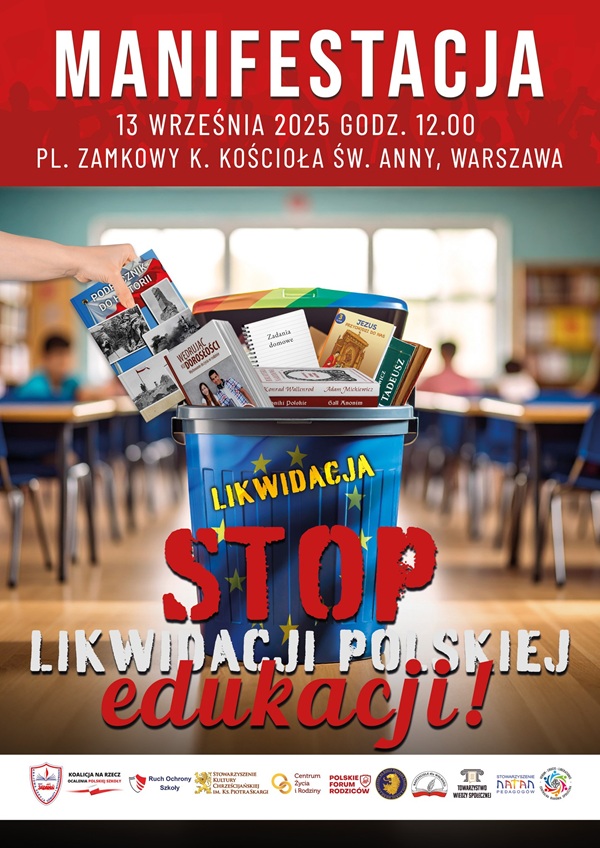 Rodzice, nauczyciele, eksperci oświatowi wzywają do natychmiastowego zatrzymania zmian w polskim szkolnictwie, które prowadzą do całkowitego podporządkowania szkół unijnym dyrektywom. „NIE dla likwidacji polskiej edukacji” brzmi hasło przewodnie manifestacji zaplanowanej na sobotę, 13 września 2025 r., godz. 12:00, na Placu Zamkowym w Warszawie.