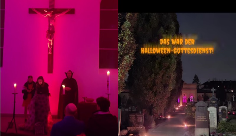Parafia kościoła miejskiego (Stadtkirche) we Fryzyndze (Freising) opublikowała w sieci krótkie nagrania ze swojego nabożeństwa. Wikariusz przebrał się za wampira i w takim stroju stał pod krucyfiksem w kościele, prowadząc modlitwy i śpiewy. Prezentowano otwarte trumny, sztuczną mgłę, fioletowe jakby upiorne światło.