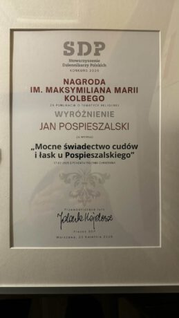 Jan Pospieszalski otrzymał wyróżnienie w kategorii Nagrody im św. Maksymiliana Kolbego za publikacje o tematyce religijnej, którą ufundowała Polska Sekcja Pomocy Kościołowi w Potrzebie. Wyróżniony został wywiad „Mocne świadectwo cudów i łask u Pospieszalskiego” przeprowadzony w PCh24 TV w lutym 2025 roku.