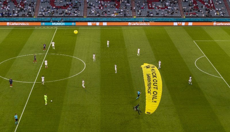 Przed meczem Francja-Niemcy w Monachium Greenpeace próbowała przeprowadzić ryzykowną akcję. Aktywista lewicowej organizacji wleciał nad Allianz Arenę na paralotni opatrzonej napisem „Wyrzućcie ropę”. Zahaczył jednak o linę podtrzymującą kamerę przekazującą obraz znad boiska i niemal spadł na trybunę dziennikarzy. Dwie osoby zostały ranne. Miało być pacyfistycznie, omal nie skończyło się większą tragedią. Potłukł się nawet trener Francji Didier Deschamps, który próbował uniknąć zderzenia ze spadającym paralotniarzem.