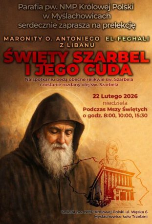 W dniach 13-23 lutego Polskę południową odwiedzi maronita z Libanu, o. Antonio El-Feghali. Na spotkaniach w 10 miejscowościach będzie mówił o cudach św. Szarbela, rozdawał olej św. Szarbela oraz udzielał błogosławieństwa jego relikwiami. Poniżej prezentujemy listę miejsc, którą odwiedzi: