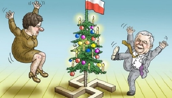 W wigilię Bożego Narodzenia służący Niemcom Słowak opublikował rysunek mający odnosić się do bliskich Polakom tradycji świątecznych. Wokół choinki zwieńczonej naszą narodową flagą „artysta” namalował dziko skaczących Jarosława Kaczyńskiego i Beatę Szydło. Negatywne przedstawienie polityków mieści w granicach dobrego smaku, jednak stojak na choinkę jest już ordynarnym atakiem zarówno na działaczy PiS jak i cały naród polski – świąteczne drzewko zwieńczone biało-czerwoną flagą opiera się na… swastyce.