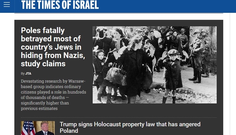 Polacy śmiertelnie zdradzili większość Żydów, ukrywających się w tym kraju przed nazistami – pisze, powołując się na książkę Jana Grabowskiego i Barbary Engelking, gazeta „Times of Israel”. W tekście mowa jest o ponad pół miliona „żydowskich ofiar Holokaustu, które zginęły w wyniku działań nieżydowskich Polaków”.