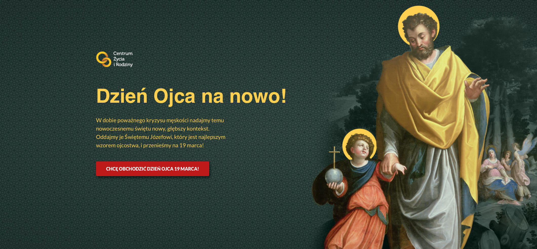 Czas nadać Dniu Ojca nową, pogłębioną treść. Centrum Życia i Rodziny rozpoczyna kampanię, której celem jest oficjalne przeniesienie tego święta na 19 marca, czyli na uroczystość św. Józefa. Na stronie www.DzienOjca.pl można odnaleźć specjalną petycję w tej sprawie.