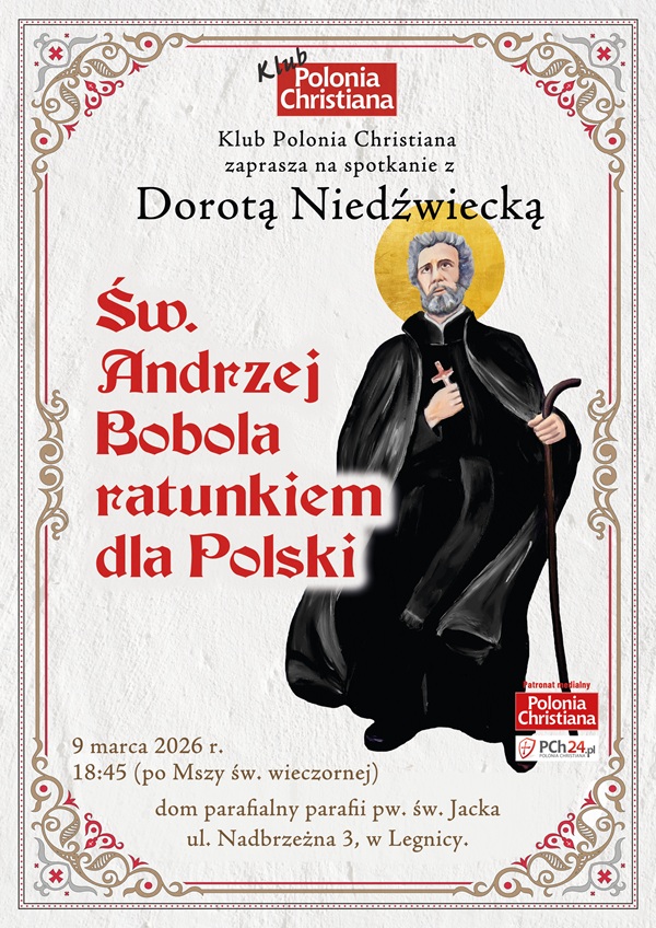 Klub Polonia Christiana zaprasza do Legnicy na spotkanie z Dorotą Niedźwiecką zatytułowane „Św. Andrzej Bobola ratunkiem dla Polski”.