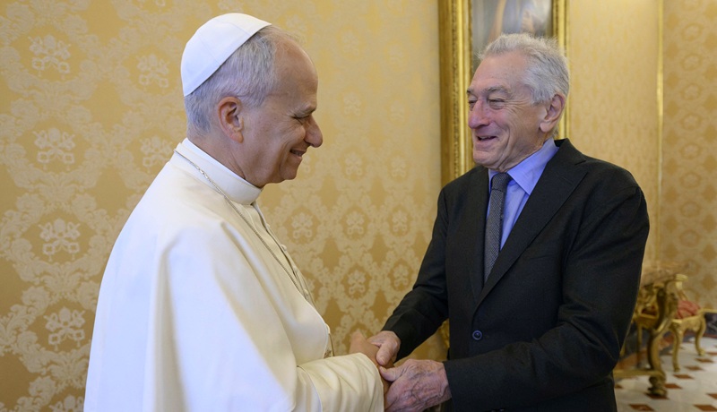 Krótkie spotkanie Leona XIV z 82-letnim zdobywcą dwóch Oscarów za role w filmach „Ojciec chrzestny II” (1974) i „Wściekły Byk” (1980) ograniczyło się do uśmiechów, wymiany uprzejmości po angielsku, wspólnej fotografii i różańca, podarowanego przez papieża.