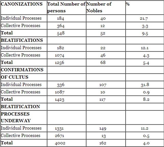 Z przedstawionych powyżej danych wynika, że w każdej z kategorii (kanonizacje, beatyfikacje, potwierdzenia kultu i trwające procesy beatyfikacyjne) odsetek szlachty jest znacznie większy niż w całej populacji kraju. Niech to zatem będzie dostatecznym dowodem na fałsz oszczerstwami o rzekomej niekompatybilności między praktykowaniem cnoty a byciem szlachcicem.