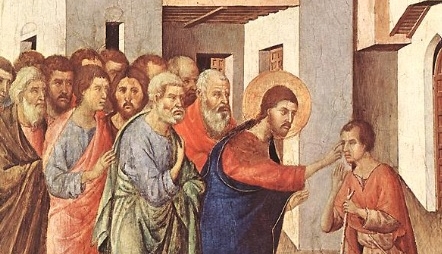 *Ewangelia wg św. Marka (8, 22-26): Jezus i uczniowie przyszli do Betsaidy. Tam przyprowadzili Mu niewidomego i prosili, żeby się go dotknął. On ujął niewidomego za rękę i wyprowadził go poza wieś. Zwilżył mu oczy śliną, położył na niego ręce i zapytał: Czy widzisz co? A gdy przejrzał, powiedział: Widzę ludzi, bo gdy chodzą, dostrzegam ich niby drzewa. Potem znowu położył ręce na jego oczy. I przejrzał /on/ zupełnie, i został uzdrowiony; wszystko widział teraz jasno i wyraźnie. Jezus odesłał go do domu ze słowami: Tylko do wsi nie wstępuj.