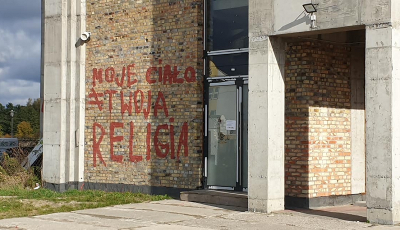 Na fasadzie budynku kościoła parafialnego znalazły się używane przez środowiska feministyczne hasła. „Moje ciało ≠ twoja religia” oraz „piekło kobiet”. Hasła mają związek z protestami zwolenników aborcji, którzy protestują w Warszawie przeciwko wyrokowi Trybunału Konstytucyjnego, który stwierdził, że tzw. przesłanka eugeniczna jest niekonstytucyjna. Lewicowi wandale wymalowali na fasadzie również „błyskawice”, które nawiązują do symboliki tzw. Strajku Kobiet.