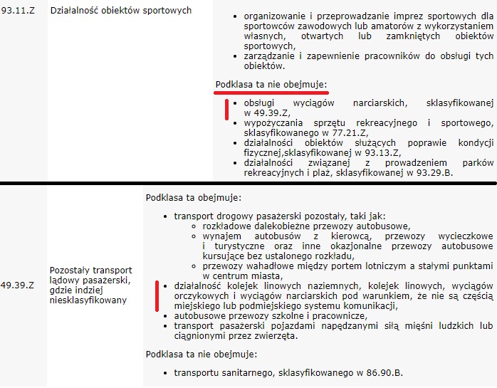 Rozporządzenie odnosi się więc do PKD 93.0 – zauważa prawnik. Tymczasem zgodnie z Polską Klasyfikacją Działalności klasa ta ani podklasy nie obejmują „działalności związanej z funkcjonowaniem kolejek linowych naziemnych i nadziemnych oraz wyciągów narciarskich, sklasyfikowanej w 49.39.Z” ani „obsługi wyciągów narciarskich, sklasyfikowanej w 49.39.Z”.