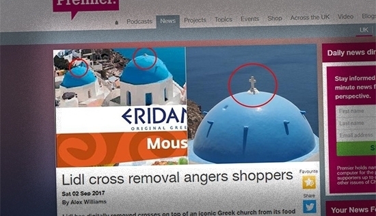 W Czechach głośno zrobiło się o cenzurowaniu na materiałach „Lidla” widoku kościoła na greckiej wyspie Santorini. We wrześniu 2017 roku ukazały się u naszych południowych sąsiadów ulotki i broszury „Lidla” z widokiem kościoła, na którym budowla z śnieżnobiałymi ścianami zwieńczona jest jasnoniebieskimi kopułami. Na materiałach „Lidla” zgadzało się wszystko poza krzyżem, który został wymazany z zastosowanych do ulotek i broszur zdjęć.