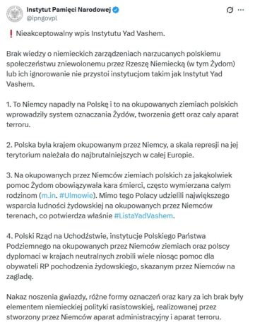 „Nieakceptowalny wpis Instytutu Yad Vashem. Brak wiedzy o niemieckich zarządzeniach narzucanych polskiemu społeczeństwu zniewolonemu przez Rzeszę Niemiecką (w tym Żydom) lub ich ignorowanie nie przystoi instytucjom takim jak Instytut Yad Vashem” – czytamy.