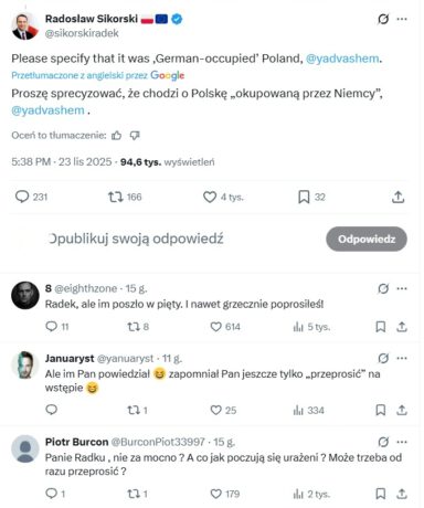 Nadzwyczaj grzecznie zareagował Radosław Sikorski. Zwierzchnik polskiego MSZ napisał: „Proszę sprecyzować, że chodzi o Polskę „okupowaną przez Niemcy”.