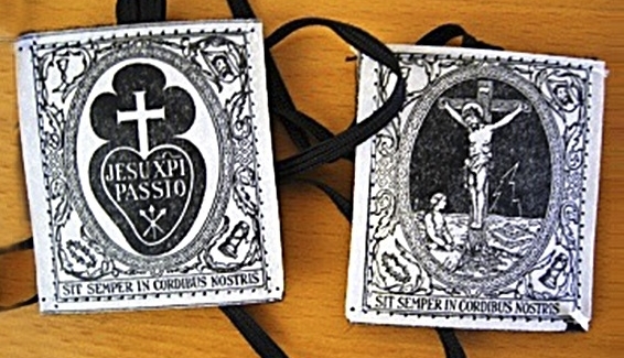 Na wełnianym czarnym prostokącie na jednym płatku znajduje się symbol pasjonistów, godło zakonu, które przedstawia białego koloru krzyżyk wpisany w czarne serce i biały napis w środku JESU XPI PASSIO, czyli Męka Jezusa Chrystusa, pod nim trzy gwoździe. W rogach znajdują się elementy symbolizujące Mekę Pańską: z lewej strony u góry chusta św. Weroniki, a z prawej korona cierniowa, na dole po lewej krzyż i po prawej kolumna do biczowania. Pośrodku na dole – kielich goryczy.